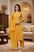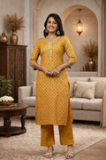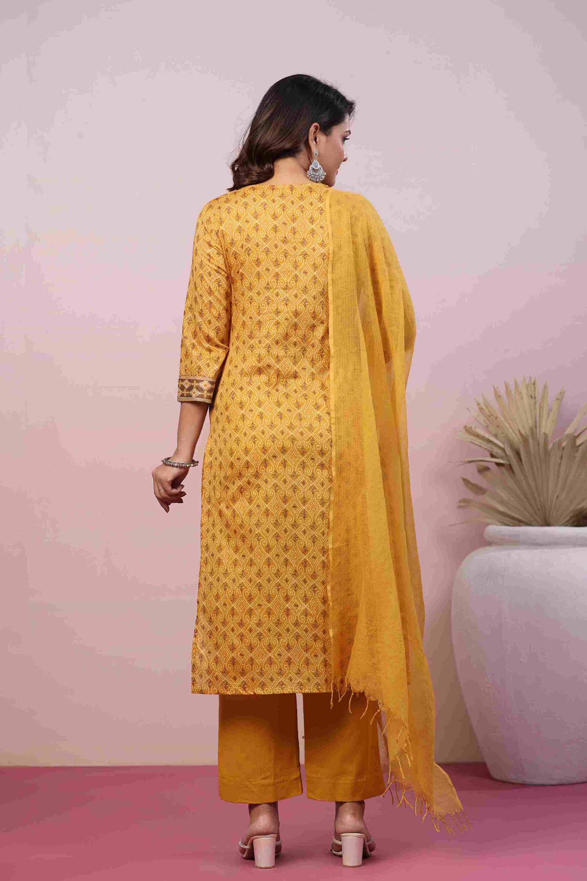 Add a touch of elegance to your ethnic wardrobe with this Yellow Cotton Suit Set, crafted from soft, breathable cotton. The straight-cut kurta features delicate floral prints, complemented by matching pants and a coordinating printed dupatta for a cohesive look. Ideal for casual outings, festive gatherings, or family events, the soothing mustard hue and comfortable fit offer both style and ease. A versatile ensemble that seamlessly blends traditional charm with modern flair.