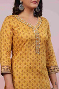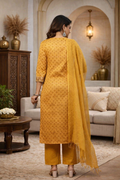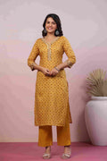 Women's Yellow Cotton Fabric Printed Suit Set | Ethnic Straight Kurta with Pants & Dupatta